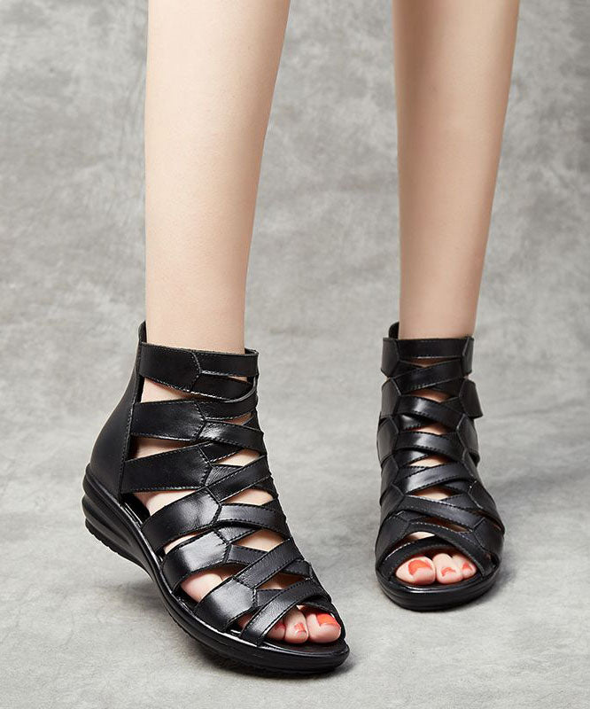 Handmade Cowhide Leather Black Wedge Sandals Splicing Hollow Out