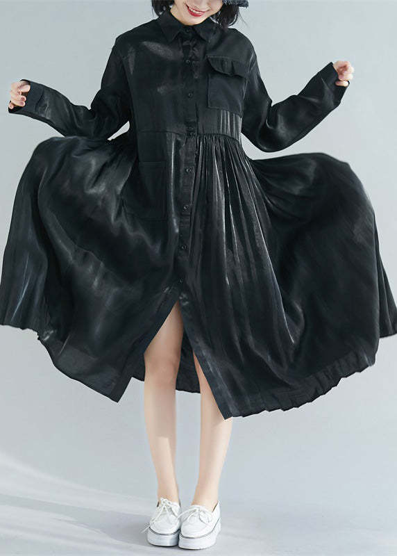 Italian Black Peter Pan Collar Patchwork Button Silk Maxi Shirts Dresses Spring