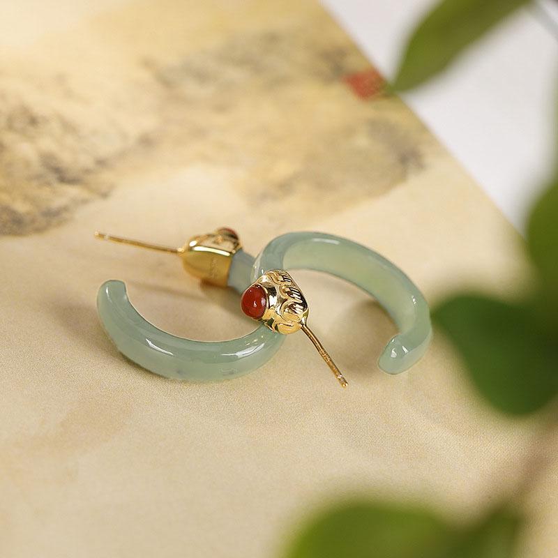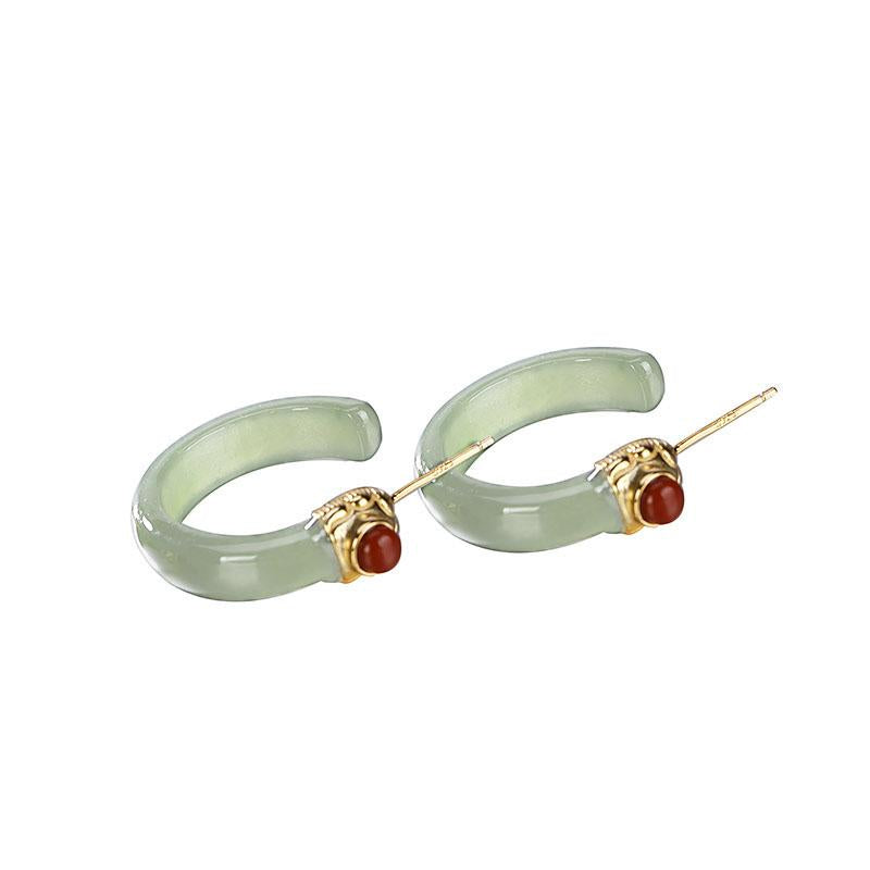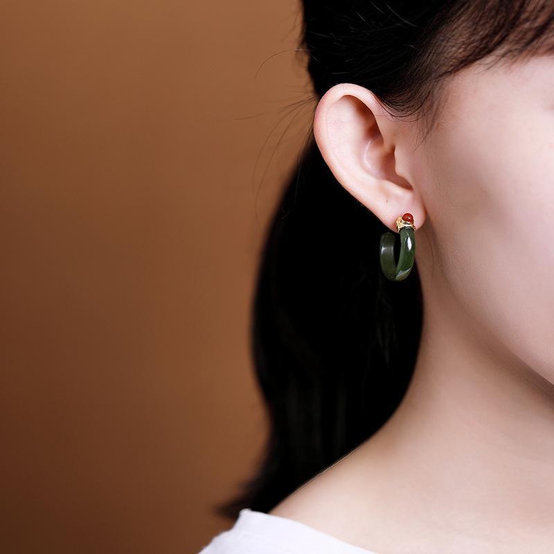 Women Retro Jade Inlaid Silver Earrings Studs
